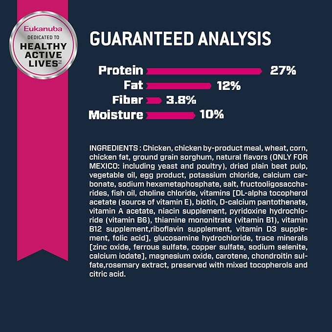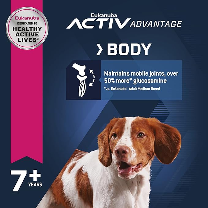 - MUSCLE & JOINT SUPPORT: Chondroitin sulfate and 50% more glucosamine (vs. Eukanuba Adult Medium Breed Dry Dog Food) helps keep joints mobile and supports lean muscles in active senior dogs
