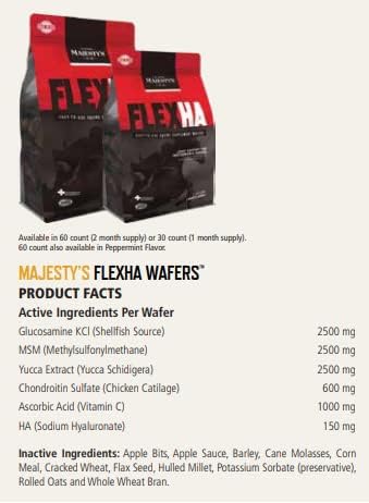 - TWO MONTH SUPPLY - Each bag contains 60 wafers. As per directions, one bag of Majasty's Flex HA Wafers will provide your horse with the care and nutrients they deserve for two months