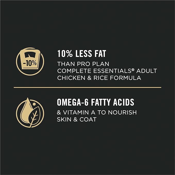 - 10 percent less fat than Pro Plan COMPLETE ESSENTIALS Adult Chicken and Rice Formula