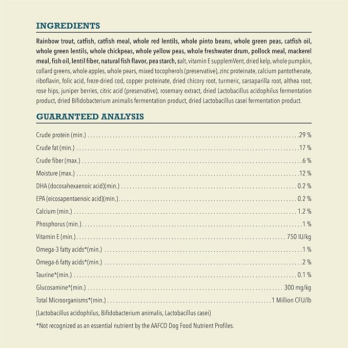 - High protein dog food recipe features raw rainbow trout, catfish & freshwater drum and is balanced to include 60 percent** high-quality animal ingredients and 40 percent*** wholesome fruit, vegetables and nutrients