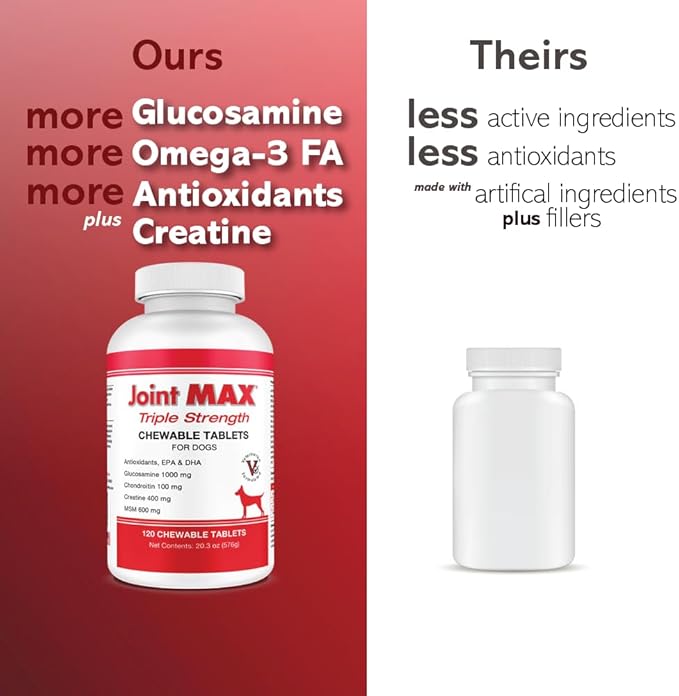 - [ANTI-INFLAMMATORY AGENTS & ANTIOXIDANTS] Joint MAX contains MSM, an organic form of sulfur. Healthy connective tissues and cartilage contain proteins with flexible sulfur bonds. Once the sulfur combines with glucosamine and chondroitin, they form collagen, a substance that gives cartilage its structure and flexibility. Antioxidants also play a significant role in the overall health of your dog and their joints. Vitamin C helps repair and construct cartilage to keep your pet mobile and happy.