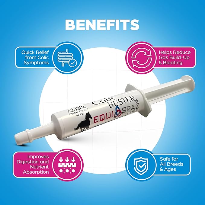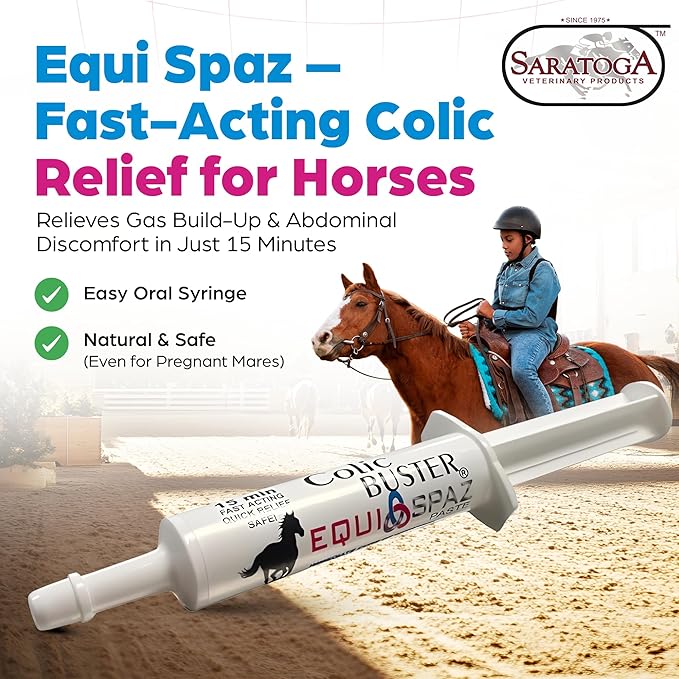 - Equi Spaz is a 15-minute fast-acting colic reliever for horses, made with natural ingredients. This powerful formula provides quick and effective relief from abdominal discomfort, ensuring your horse feels better swiftly. Safe and easy to administer, Equi Spaz is gentle enough for regular use and safe for pregnant mares. Trust Equi Spaz to keep your equine companion comfortable and healthy.