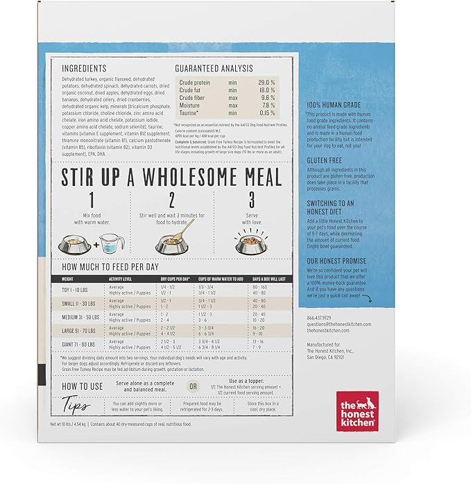 - GRAIN FREE, CAGE FREE TURKEY: The Honest Kitchen Grain Free Turkey dog food is made with real whole food ingredients like cage free turkey, spinach & coconuts, which are gently dehydrated for maximum nutrient retention and easy digestion.