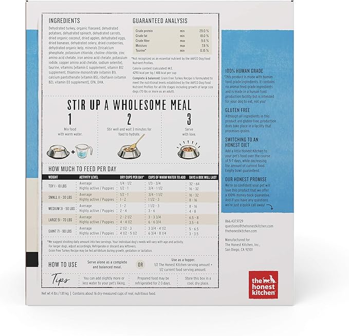 - COMPLETE AND BALANCED NUTRITION FOR YOUR DOGS: The Honest Kitchen Dehydrated Dog Food provides a wholesome, grain free dog food with cage free turkey, sweet potatoes, and green beans for optimal health