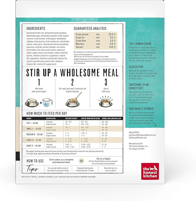 The Honest Kitchen Human Grade Dehydrated Grain Free Dog Food – Complete Meal or Dog Food Topper – Fish 10 lb (makes 40 lbs)