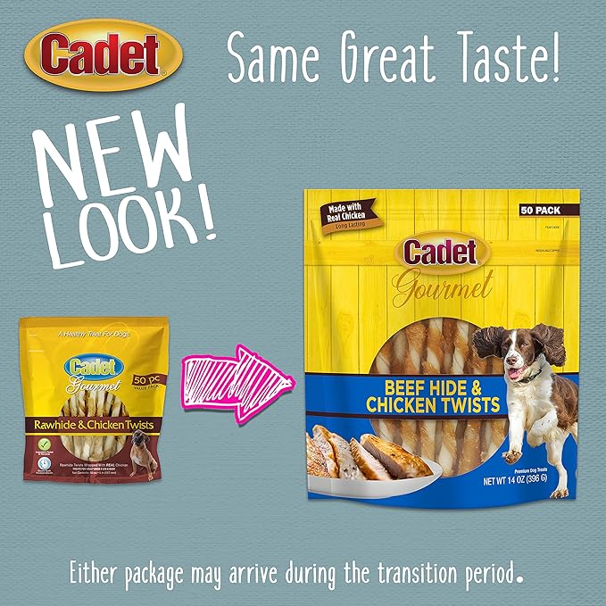 Cadet Gourmet 5-Inch Beef Hide Twist Chew Sticks, Long-Lasting and Natural Rawhide Chews for Dogs, Inspected & Tested in USA, Chicken Flavor, 50 Count