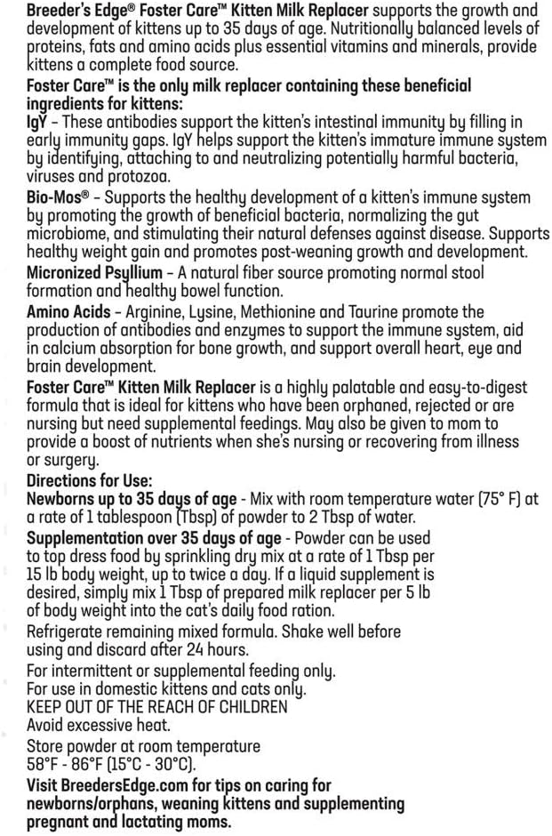 Breeder's Edge Foster Care Feline - Powdered Milk Replacer - for Kittens & Cats - 12oz