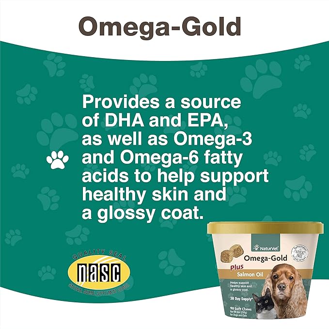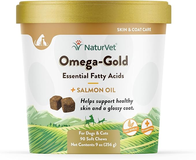 NaturVet – Omega-Gold Plus Salmon Oil | Supports Healthy Skin & Glossy Coat | Enhanced with DHA, EPA, Omega-3 & Omega-6 | for Dogs & Cats | 90 Soft Chews