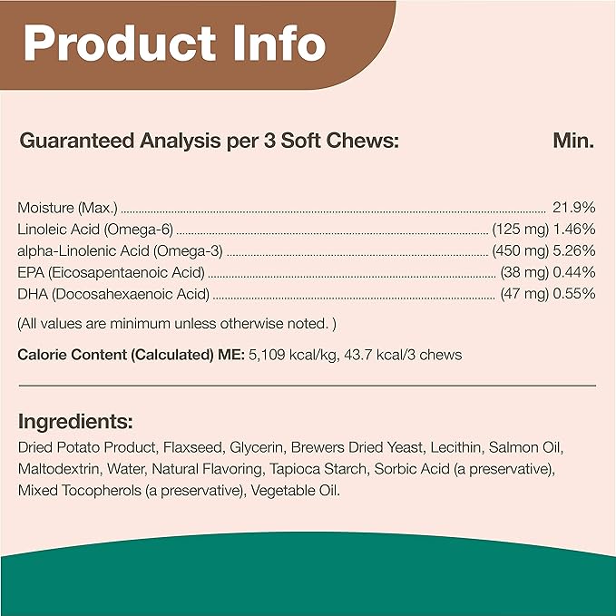 - Guaranteed Analysis per 3 soft chews: Linoleic Acid (Omega-6 Fatty Acid), Linolenic Acid (Omega-3 Fatty Acid), DHA and EPA.