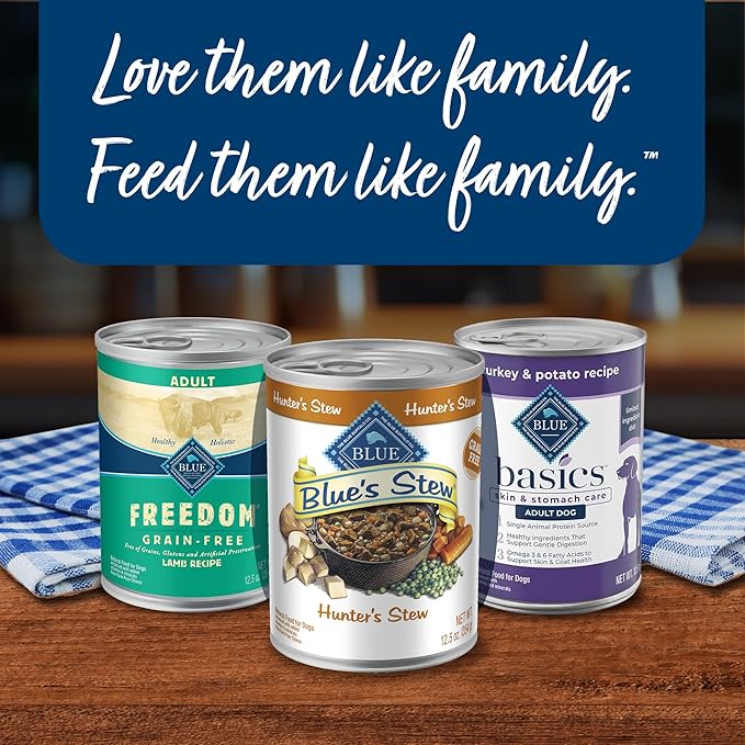 - Contains Twelve (12) 12.5-oz cans of Blue Buffalo Blue's Stew Natural Adult Wet Dog Food, Hunter's Stew