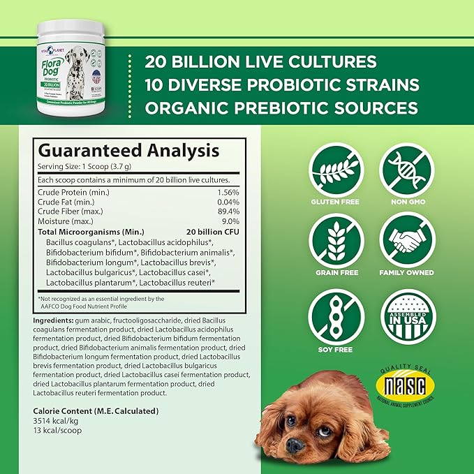 - Premium Probiotic for Dogs - Flora Dog is a high quality, high potency daily probiotic formula with 20 Billion live cultures per serving from 10 clinically studied strains plus organic prebiotics to help feed the beneficial probiotics in your dog’s digestive tract. It provides multiple health benefits: promotes digestive balance and proper digestion, supports bowel and immune health including seasonal allergies, and supports the gut microbiome by replenishing beneficial microflora every day.