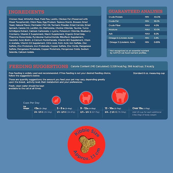 - Ingredients: Contains chicken meal, field peas, chicken fat, whitefish meal, buffalo meal, tapioca starch, lentils, chickpeas, egg product, and more