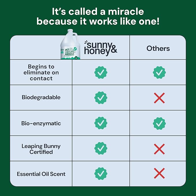 - Pet Stain Hero: Meet Sunny & Honey's Pet Stain & Odor Miracle, your trusty carpet cleaner solution for those pesky pet accidents. It’s a top pet stain remover that leaves behind a fresh spring mint scent