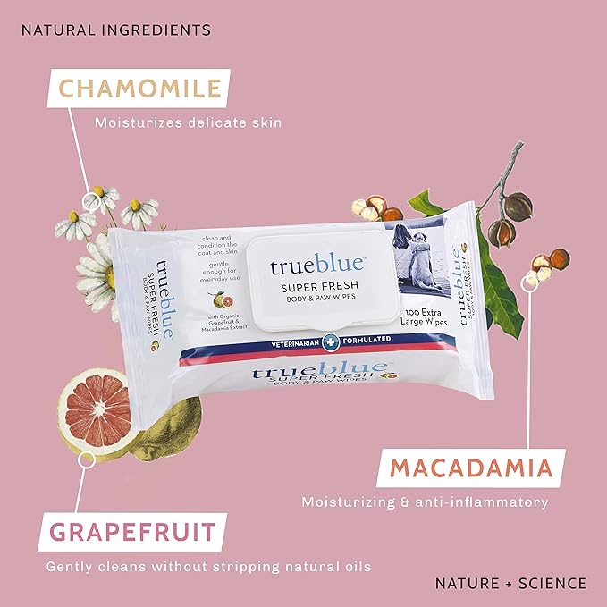 TrueBlue Super Fresh Body and Paw Wipes for Dogs and Puppies - Clean Dirty Paws and for deodorizing - Extra Large, Non-Toxic - 8"x7" - 100 Count