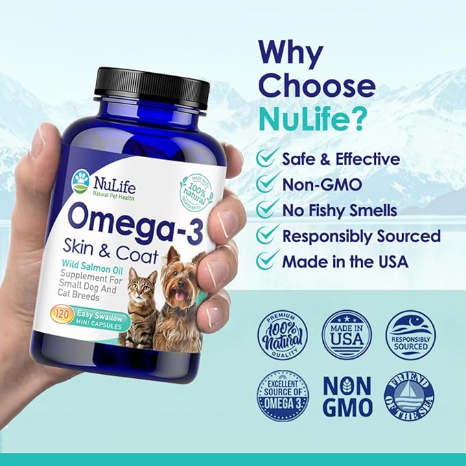 - EASY TO SWALLOW CAPSULES - NuLife Omega 3 for Dogs & Cats comes in an easy to swallow, unscented, 500mg softgel capsule. The convenient oval shaped fish oil pills are small enough for pets of all sizes to swallow, especially smaller breeds and puppies. The best omega 3 pet supplement you’ll find anywhere