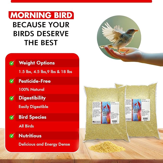 Morning Bird Hulled Millet – Nutritious Seed, Easily Digestible with High Fiber, Rich in Vitamins and Supplements for Birds, Ideal Bird Feed for All Bird Types, 18 lbs (2-Pack, 9 lbs Each)