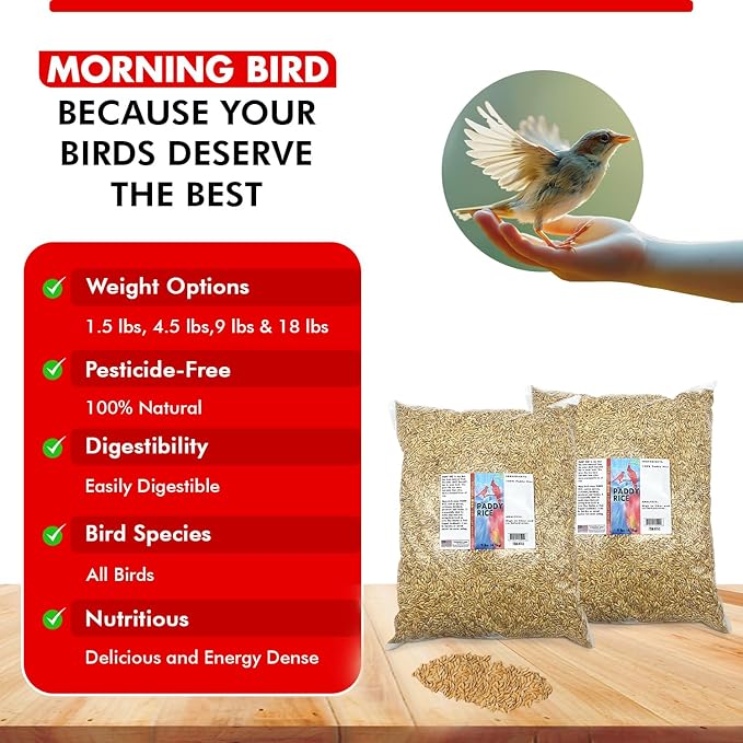 Morning Bird Paddy Rice Bird Seed for Optimal Health & Nutritious Pet Bird Food – Supports Feathers & Immunity – Ideal for All Seed Eating Birds.18 lbs (2-Pack, 9 lbs Each)