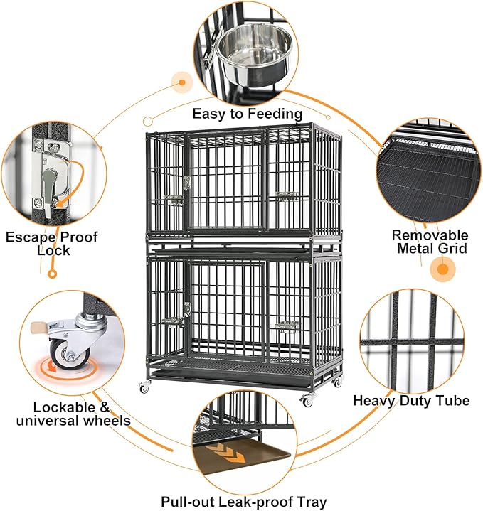 Homey Pet 37 Inch Stackable Heavy Duty Dog Crate Cage Kennel with Feeding Bowls, Lockable Wheels and Removable Tray, Escape Proof Wire Drop Dog Crates for Medium Dogs (Two Tiers)