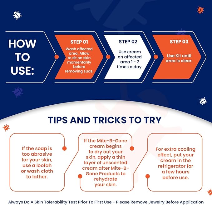 - OUR PRODUCT FORMS A DEFENSE LAYER ON YOUR SKIN: Mite-B-Gone is an extra-strength cream that powerfully provides fast relief for itchy and irritated skin and is gentle enough to use all over the body daily to form a skin defense layer on your skin for added protection against skin irritations and bites.