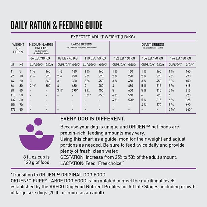 - This ORIJEN dog food kibble is tailored for large breed puppies with high protein and fat content to support peak development