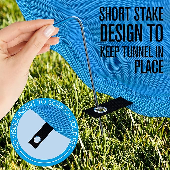- DURABLE MATERIAL: This agility dog training tunnel is lined with a covering made from lightweight yet surprisingly durable 600D woven Oxford Dacron. Included in the set are 8-10 anti-rust zinc plated 7” stakes that insert through the metal grommet tabs around the base of the tunnel. The downward angled tops of the stakes are designed to not protrude out of the ground so they don’t cause harm to your dogs while they play.
