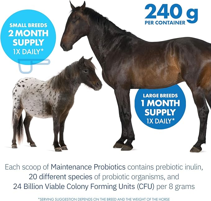- SINGLE DAILY INTAKE: Feed probiotics to your horse on a daily basis; Made from quality and purity tested human grade ingredients and manufactured with human grade standards; Non-GMO formula, made in the USA