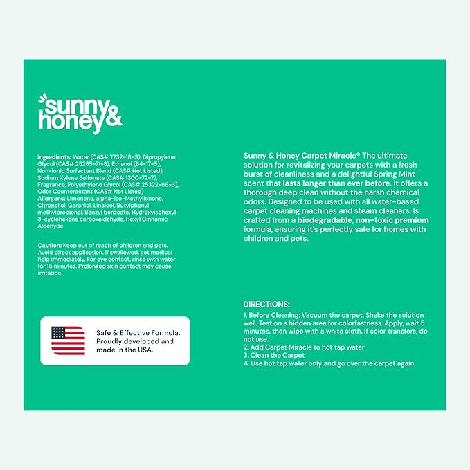 - Sunny & Honey Magic: Meet Sunny & Honey Carpet Miracle, your go-to carpet cleaner solution that works wonders on any carpet shampooer. This pet carpet cleaner solution leaves your home smelling minty fresh and looking spotless