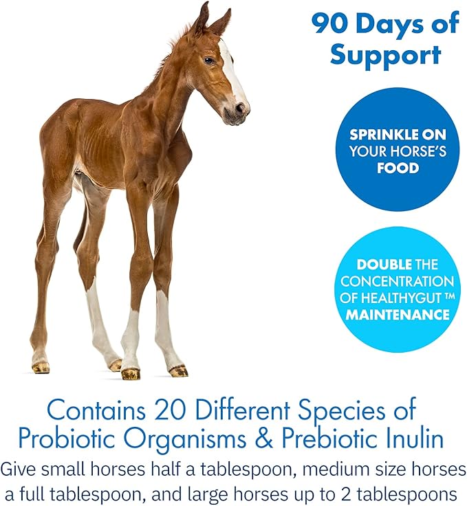 - SINGLE DAILY INTAKE: Sprinkle the scoops of probiotic supplement on your horse’s food on a daily basis; DOUBLE the concentration of HealthyGut Maintenance; Made from quality and purity tested human grade ingredients and manufactured with human grade standards