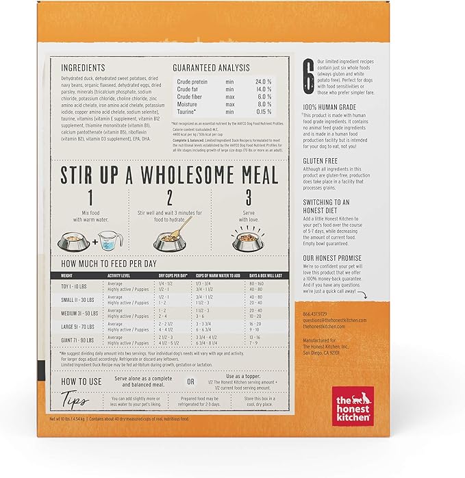 The Honest Kitchen Limited Ingredient Duck Grain Free Dehydrated Dog Food - Duck, 10 Pound Box