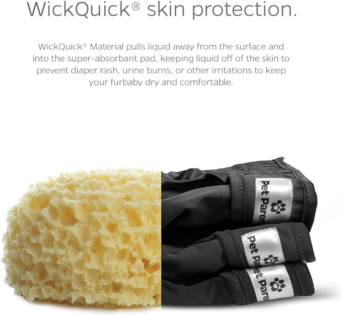 - HIGHLY ABSORBENT DOGGIE DIAPERS: Because we know your Great Dane 'goes' more than your Chihuahua, the diaper pad that is sewn into our dog diapers female increases with the size, because bigger dogs = more liquids. WickQuick material wicks liquid from the surface and into the dog period diapers, keeping your furbaby dry and reducing urine burn or irritation. Our diapers also have a waterproof outer layer to prevent leaks and damage to rugs, carpets, upholstered chairs and sofas.
