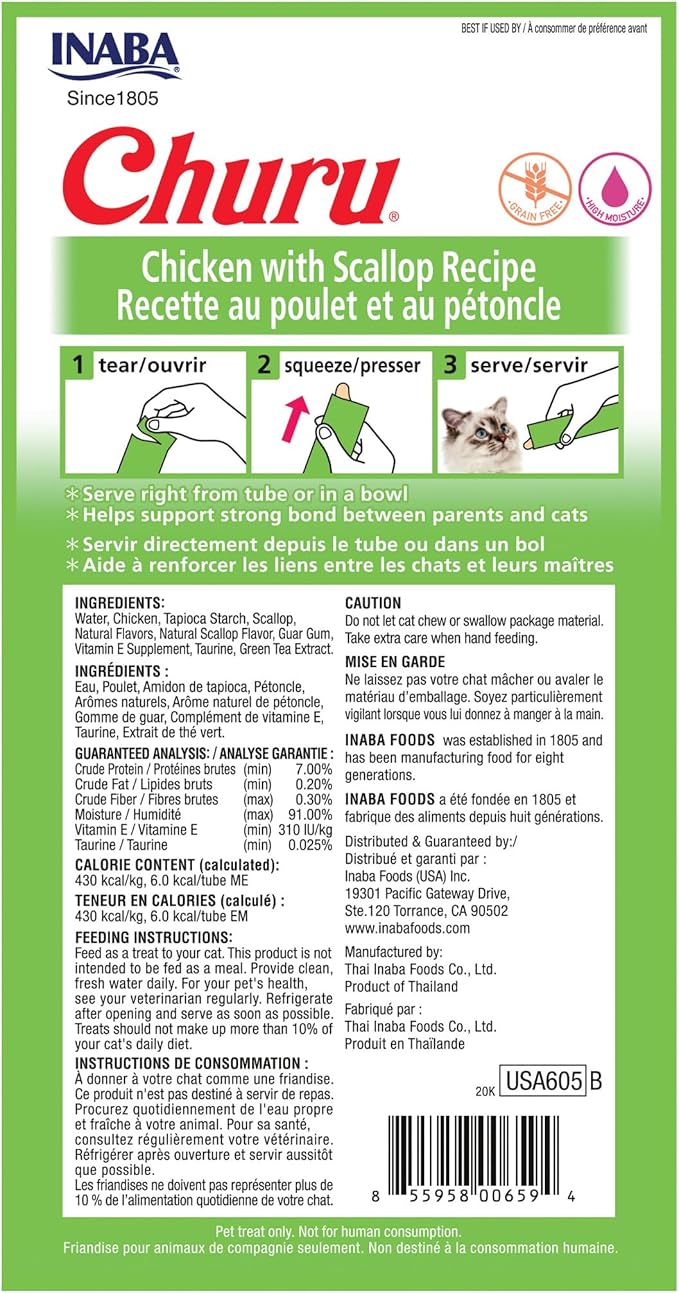 INABA Churu Cat Treats, Grain-Free, Lickable, Squeezable Creamy Purée Cat Treat/Topper with Vitamin E & Taurine, 0.5 Ounces Each Tube, 4 Tubes, Chicken with Scallop Recipe