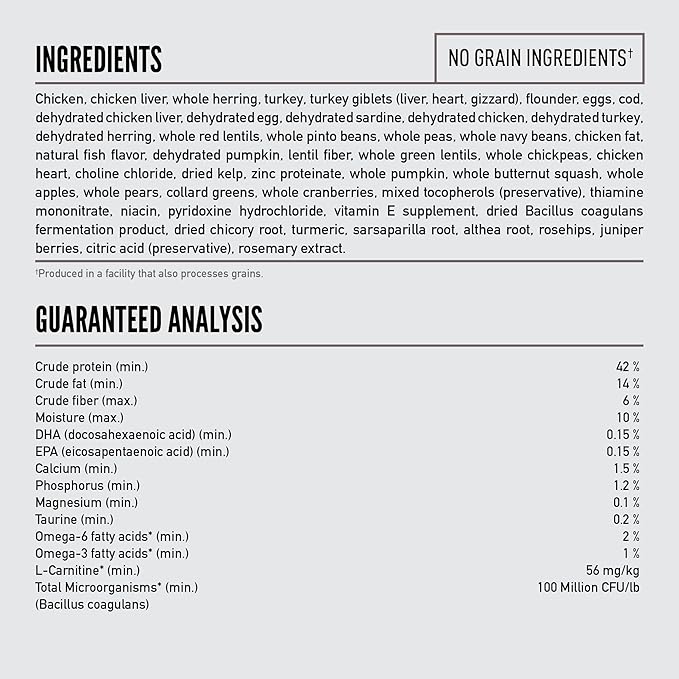 - Grain free* dry cat food containing up to 85 percent** animal ingredients, including organ and bone WholePrey ingredients to mimic cats' ancestral diets
