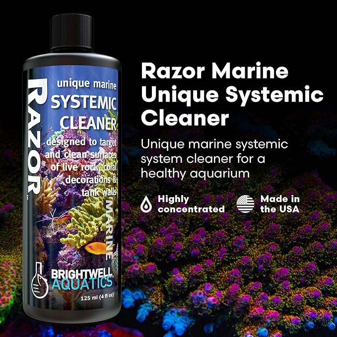 - SAFE USAGE – Razor Marine is a slow-acting aquarium glass and decoration cleaner, and may require multiple applications for the safety of marine fishes, corals, invertebrates, and macro-algae. Suspend the usage of activated carbon during product application, then resume after achieving the desired appearance