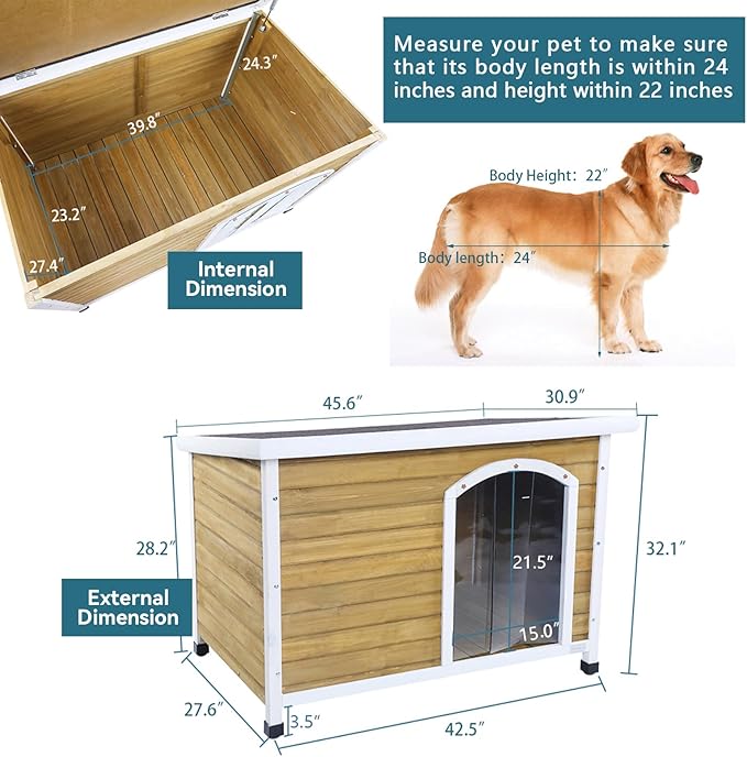 - Large Dog House Outdoor: Our large dog house measures 45.6"L x 30.9"W x 32.1”H/28.2”H. It is ideal for medium to large dog breeds with an adult weight of up to 80 pounds. Please kindly measure your pets to find a suitable dog shelter before purchasing