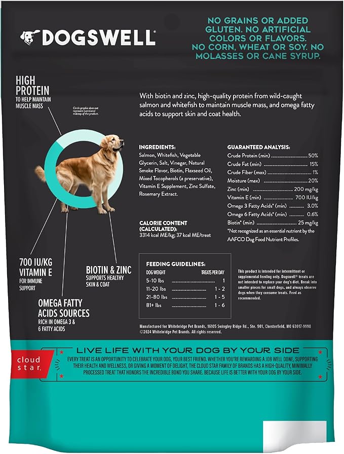- SUPPORT THEIR SKIN & COAT Each piece of this delicious jerky is formulated with a special blend of ingredients such as biotin and zinc to support healthy skin and coat, vitamin E for immune support, and omega fatty acids from salmon and whitefish.