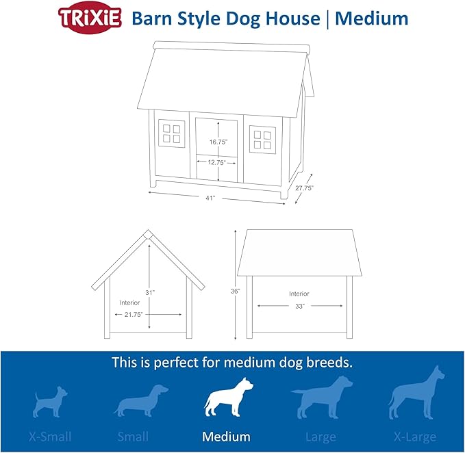 - DOG SHELTER: The TRIXIE Natura Barn Style is a medium dog house for outside & a great place for your pooch to rest. With dimensions of 41 x 27.75 x 36 in, it’s suitable for small- to medium-sized dogs