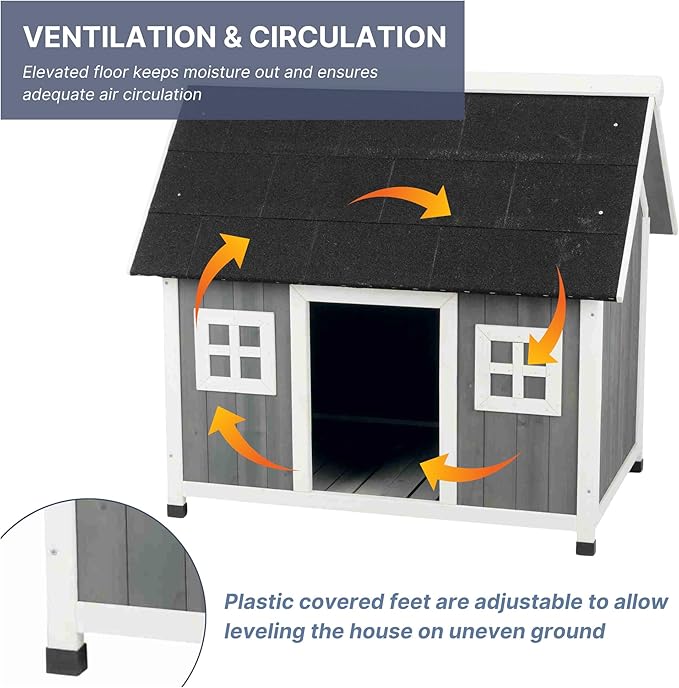 - FUNCTIONAL: The peaked roof and the roof overhang of the waterproof dog house shed rainwater fast, while the adjustable legs keep moisture out of the dog kennel. The removable floor panels ease cleaning