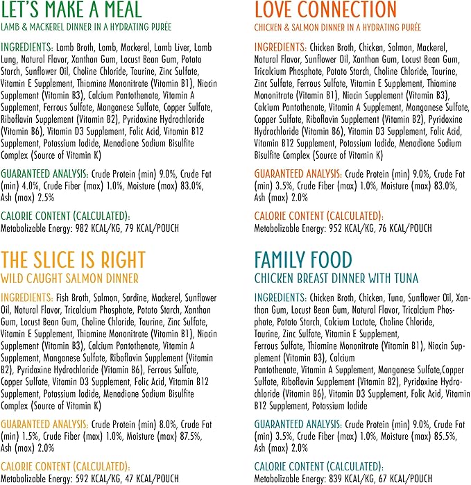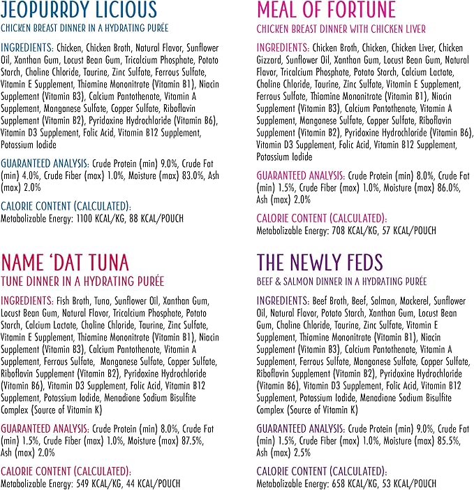 - Variety Pack includes 2 pouches of each: The Newly Feds, Jeopurrdy Licious, Love Connection, Let’s Make a Meal, Meal of Fortune, Name 'Dat Tuna, The Slice is Right, Family Food