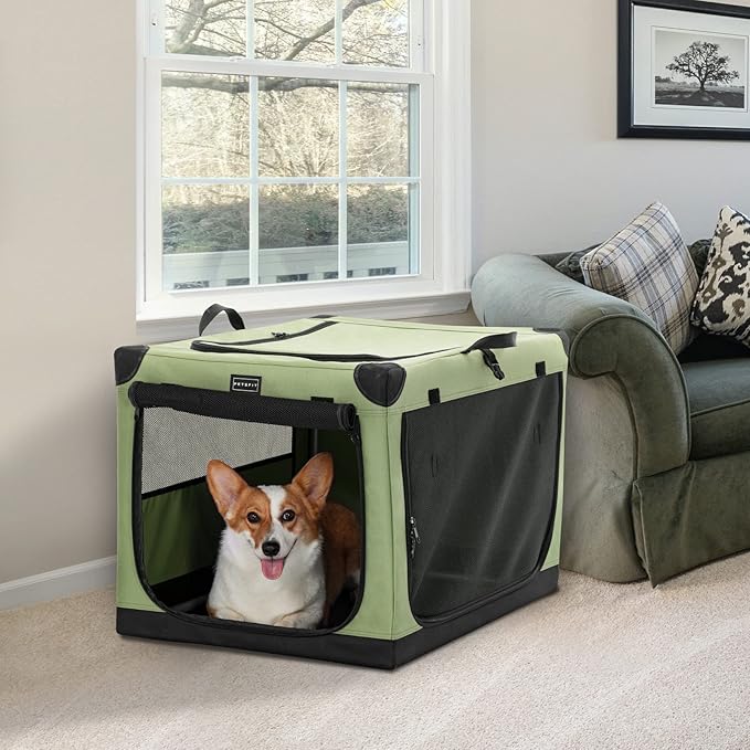 PETSFIT Soft Dog Crate, with Patented Adjustable Fabric Cover, Chewproof & Lockable Mesh Doors, Waterproof Base Collapsible Kennel Green 30 Inch
