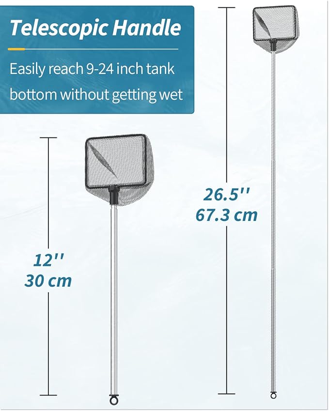 - Telescopic Handle: The solid stainless steel handle won’t get rust or bent. It can extend up to 24". Easily reach the bottom of tanks up to 9-24 inches deep without wetting your hands.