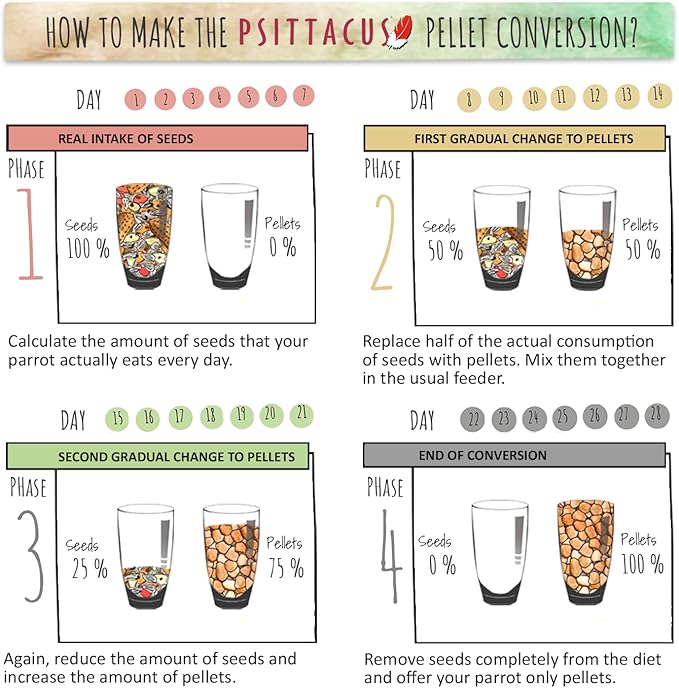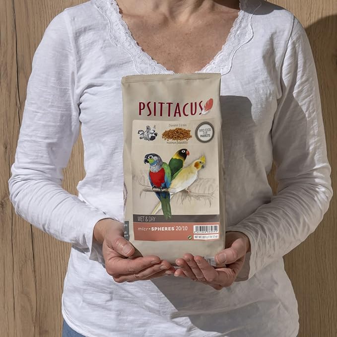 - PSITTACUS MICROSPHERES 20/10: It’s a micro-extruded pellet for parrots. It's suitable for young and adult birds. It can be used dry or hydrated as a diet complement in chops and salads to nutritionally enrich them. It comes in a 800 g package.