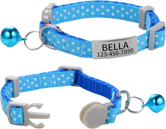 Custom Breakaway Cat Collars with Bell - Engraved Stainless Steel No Noise Slide-On Identification Tags On Collar - Up to 3 Lines of Personalized Text (Polka Dot Print)