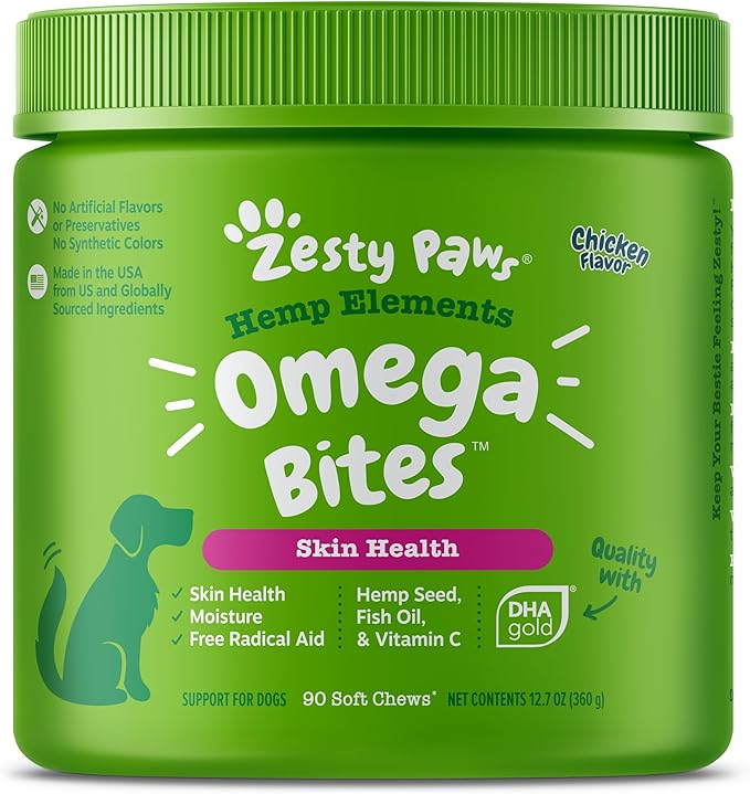 Zesty Paws Skin & Coat Bites for Dogs – Fish Oil Soft Chews with Omega-3 Fatty Acids EPA & DHA - Skin, Coat, Antioxidant & Immune Support - Hemp - 90 Count