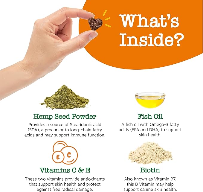 - Paw-erful Skin Support - These soft chews also include Cod Liver Oil, Biotin (Vitamin B7), Zinc, and Vitamin E to provide additional antioxidants and support for your dog's skin health.