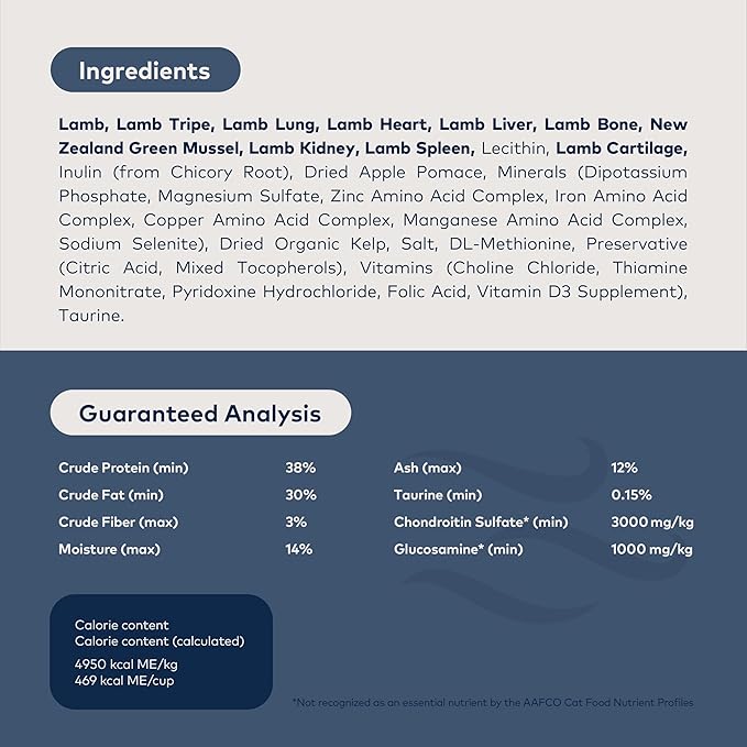 - HIGH PROTEIN, NUTRIENT DENSE: Featuring 96% free-range Lamb, Organs, Bone, and New Zealand Green Mussels, this grain-free cat food delivers nutrition with a mouth-watering taste for all cats. Gentle air dried processing retains the goodness of the raw ingredients. This food supports indoor cat food needs and is perfect for all life stages, from kitten food to senior cats.