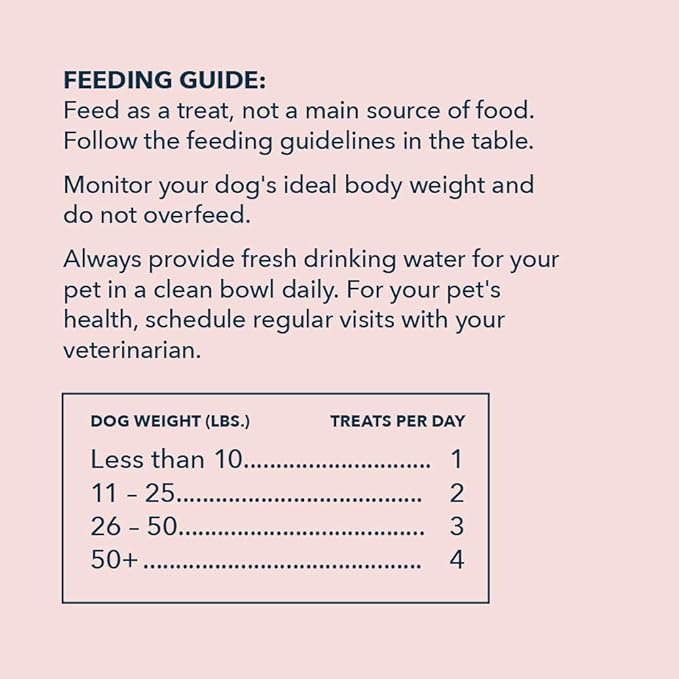 - FEEDING GUIDE: You may break the jerky into smaller pieces for treating; if it’s your dog’s first time start with half of the suggested treating amount and gradually increase to the full amount
