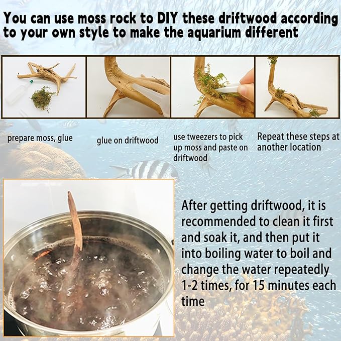 - 【Decorate With Moss】Driftwood will naturally sink after treatment.You can glue several driftwood branches together to DIY a better looking driftwood decoration,or glue moss on the driftwood branches to create a vibrant Moss tree.