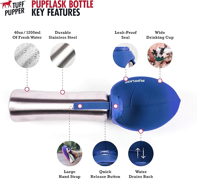 - HAPPY, HYDRATED PETS make the best traveling companions, and the PupFlask goes wherever you and your furry friend venture. Reversible leaf-shaped bowl lays flat over bottle when not in use.