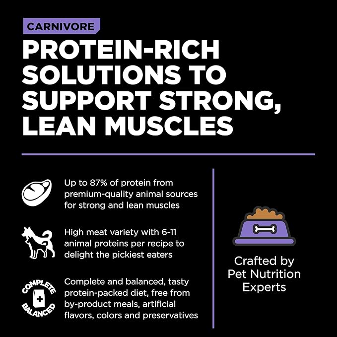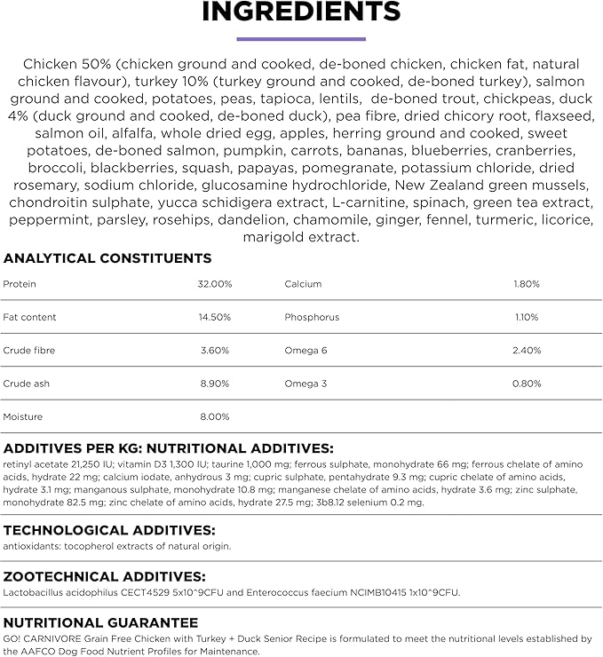 - PROTEIN-RICH FOOD TO SUPPORT STRONG, LEAN MUSCLES: The first six ingredients and 85% of the protein in our grain free CARNIVORE Chicken, Turkey + Duck Senior dog food comes from real premium-quality meat + fish.