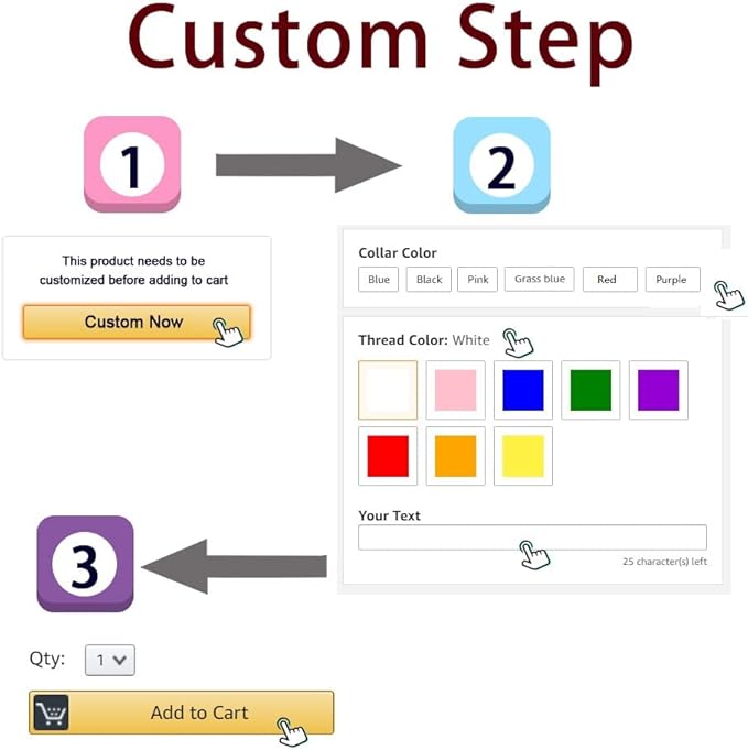 - TO ORDER CLICK CUSTOMIZE NOW and enter:(1)COLLAR COLOR (2)THREAD COLOR,(3) COLLAR TEXT: Pet Name and Phone Number - 25 characters maximum. When finished customizing collar, click Add to Cart.